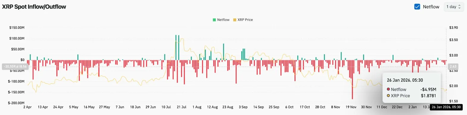 Данные обменных потоков показывают давление продаж под поверхностью. Coinglass зафиксировал чистые оттоки в размере $4,95 миллиона 26 января, что означает, что монеты переходят на биржи, а не в частные кошельки.