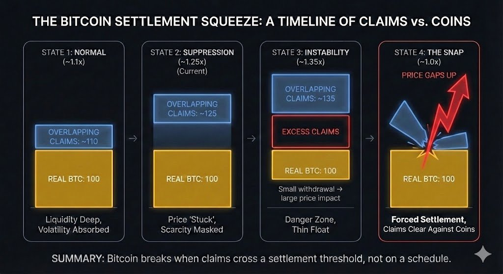 Автор подчеркивает, что такие движения носят нелинейный характер. Цена может долго оставаться стабильной, пока биткоин существует в виде обязательств внутри платформ. В момент, когда обязательства должны быть погашены реальными монетами, доступное предложение резко сокращается, и рынок реагирует скачком.
