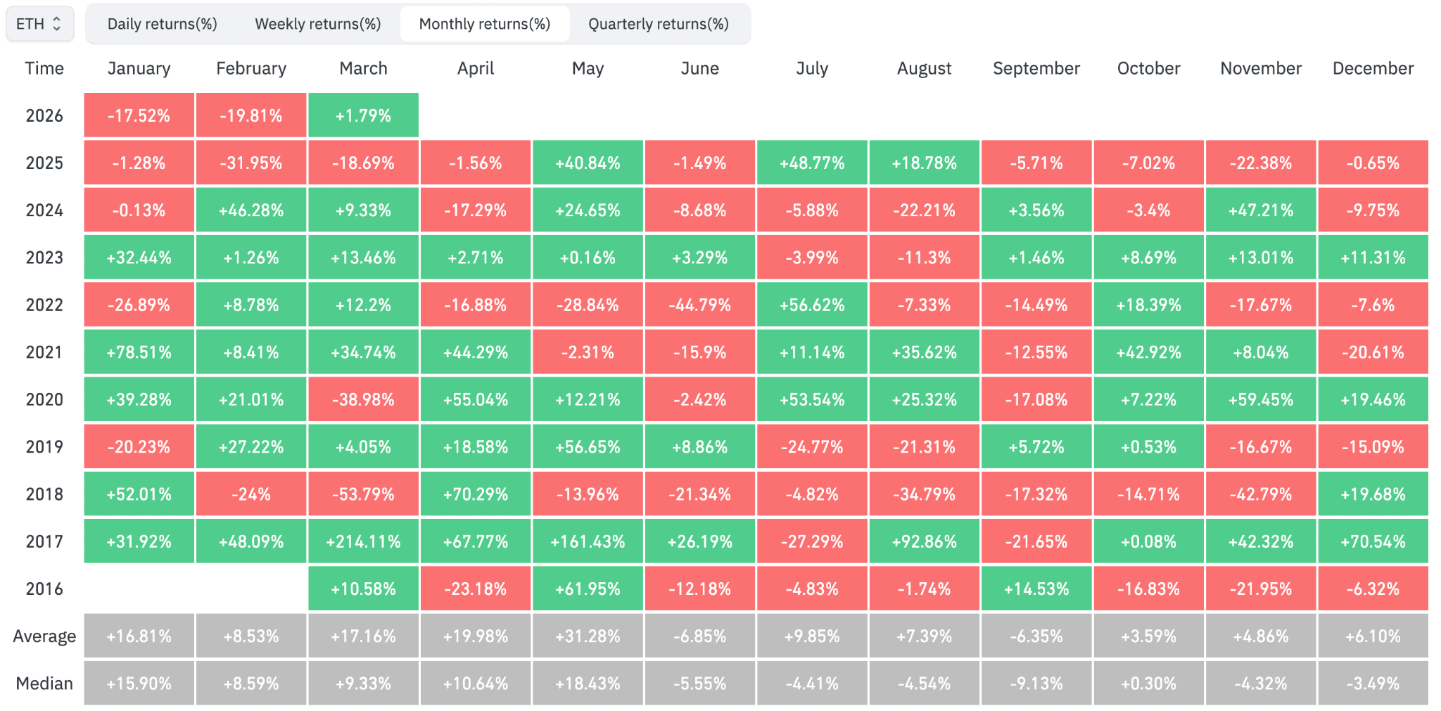 Вместе с тем для Ethereum февраль оказался еще хуже, поскольку вторая по капитализации криптовалюта просела на 19,81%, продемонстрировав негативную динамику в третий раз за время ее существования и второй год подряд. С 2019 по 2024 год актив закрывал месяц с приростом иногда более чем на 40%.