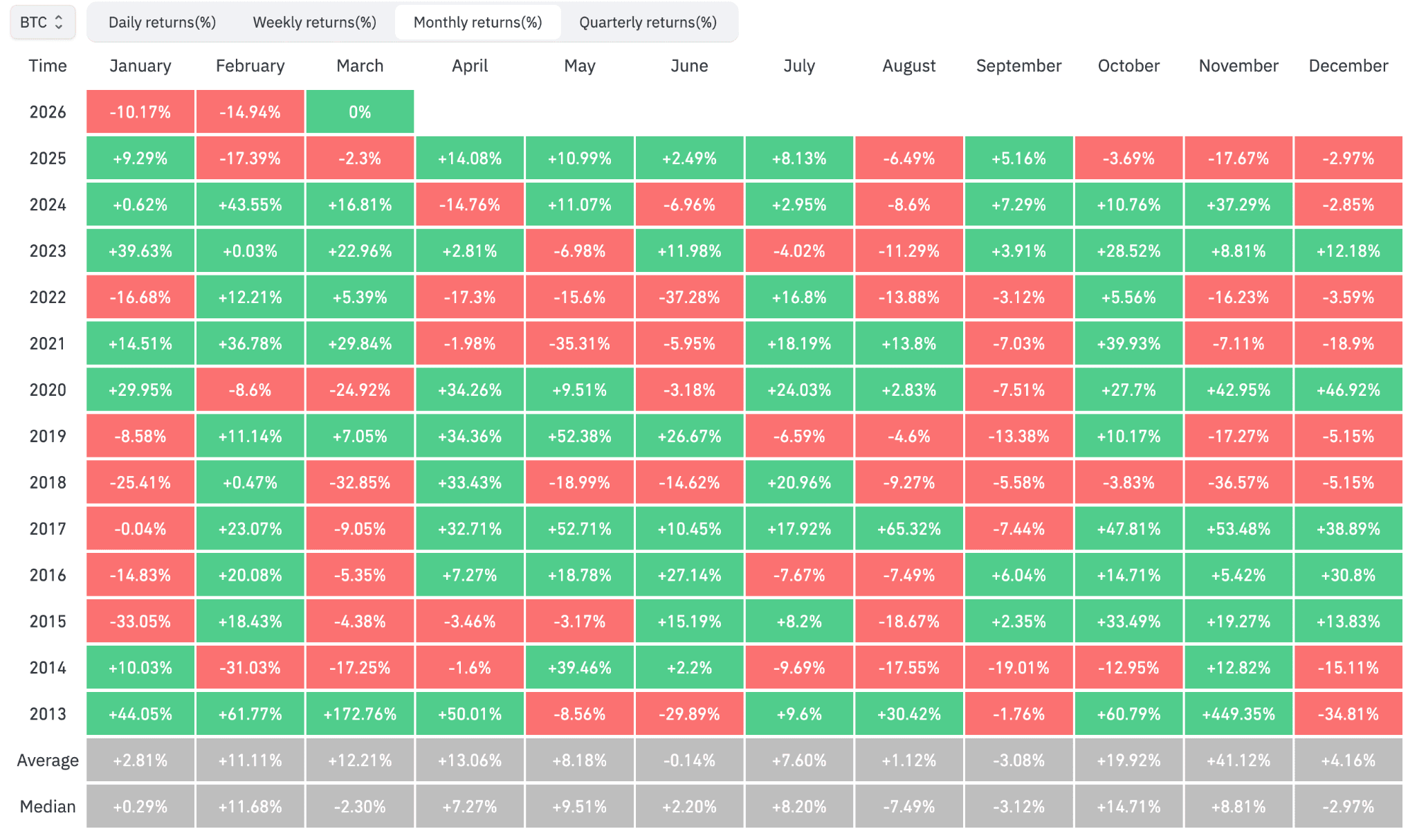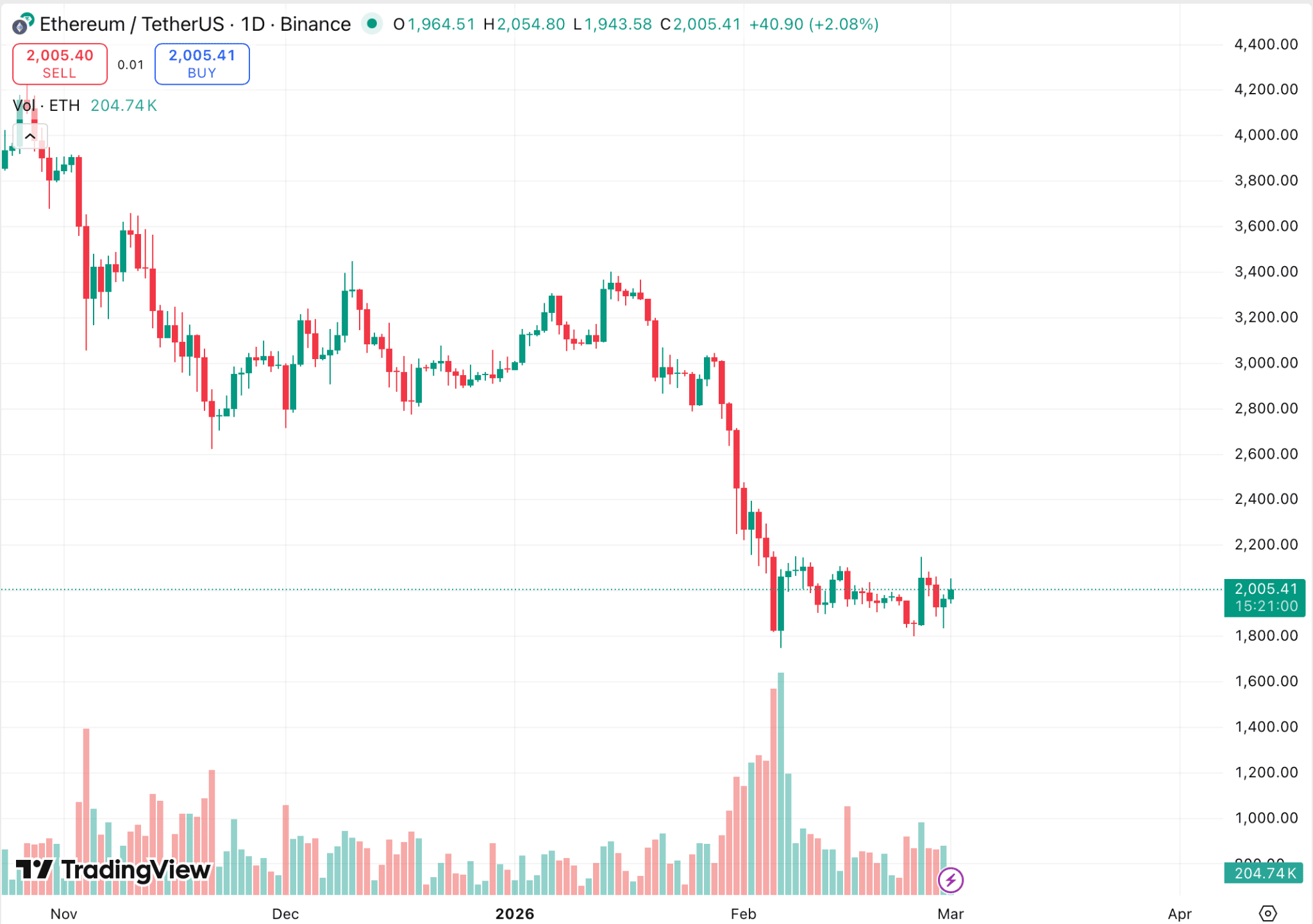 В феврале 2026 года биткоин продолжил падать и показал снижение на 14,94%. Негативная динамика продолжается пятый месяц подряд, тогда как такое падение наблюдается в четвертый раз в истории актива. В то же время Ethereum опустился на 19,81%, закрыв месяц «в красной зоне» в шестой раз с сентября 2025 года.