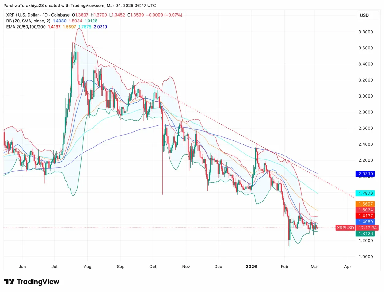 Дневной график показывает, что $XRP застрял в нисходящем канале с июльских максимумов 2025 года около $3.70. Цена торгуется ниже всех четырёх основных EMA: 20-дневная — $1.4137, 50-дневная — $1.5697, 100-дневная — $1.7876, а 200-дневная — $2.0319, образуя накопленный потолок сопротивления.