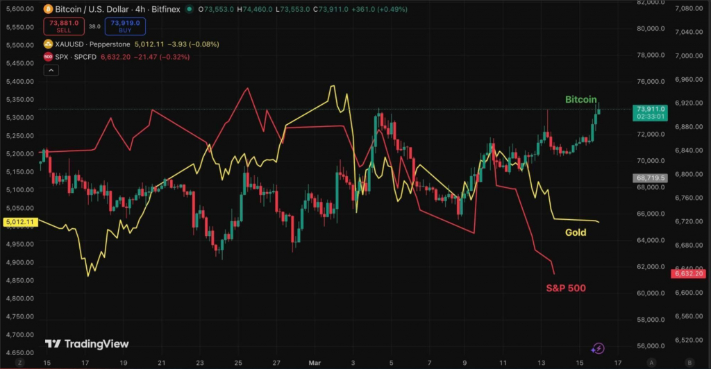 Биткоин пробил отметку $74 000 и вернулся к уровням начала февраля. 16 марта на бирже Bitstamp цена достигла $74 425 — максимума с 4 февраля. Недельный прирост составил 10,3%, а недельная свеча закрылась выше 200-недельной экспоненциальной скользящей средней — уровня, традиционно разделяющего бычий и медвежий рынки.