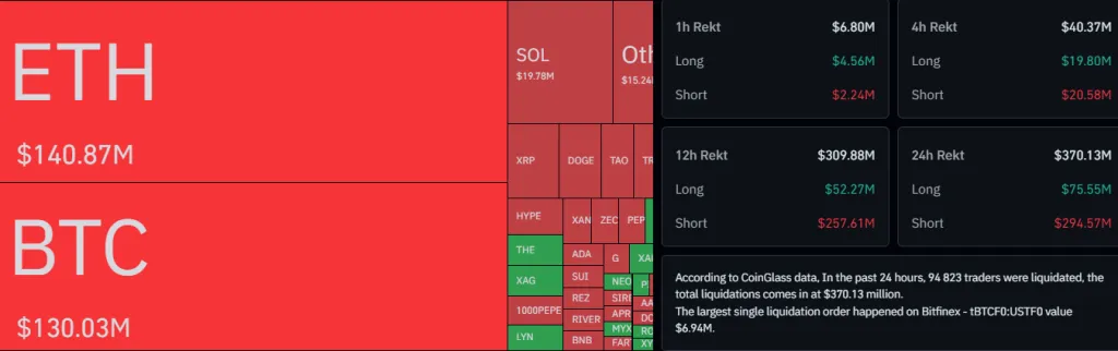 За сутки объем ликвидаций на крипторынке составил $370,13 млн. Наиболее крупные принудительные закрытия позиций зафиксированы по Ethereum ($140,87 млн), при этом основная масса убытков пришлась на шорты ($122,87 млн).