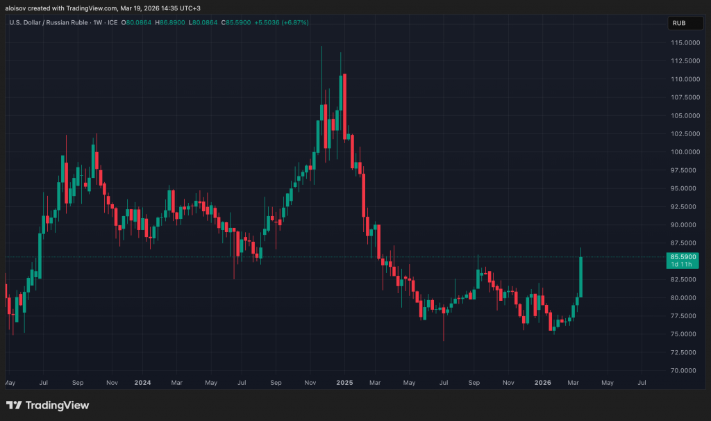 Рубль обновил минимум с начала 2025 года: на внебиржевом рынке доллар достиг 85,59 рубля, за неделю потеряв почти 7%. Официальный курс ЦБ на 19 марта — 83,13 рубля, однако рыночная цена уже существенно выше.