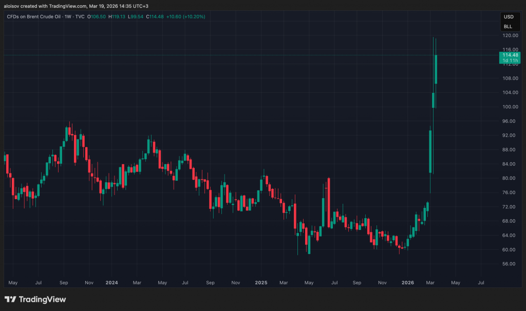 Brent за текущую неделю прибавила более 10%, достигнув $119,13 и закрепившись выше $114. Глава РФПИ и спецпредставитель президента РФ Кирилл Дмитриев (Kirill Dmitriev) ещё 16 марта написал в X, что нефть движется к $150 и выше в ближайшие 2–3 недели — перебои в Ормузском проливе ударили не только по логистике, но и по самой добыче. 18 марта он подтвердил прогноз, сославшись на публикацию The Wall Street Journal о пробое $110.
