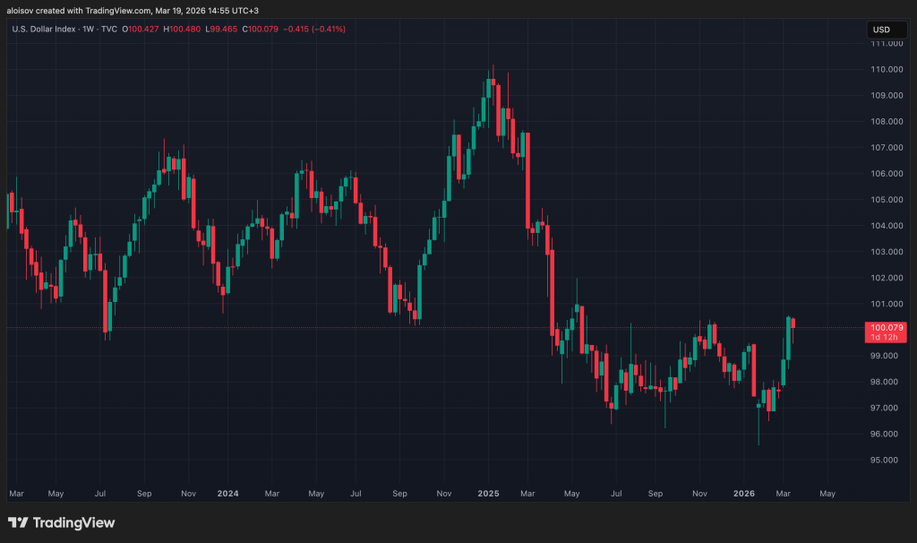 Прежде чем говорить о рубле, важен глобальный контекст. Индекс доллара DXY — показатель силы американской валюты к корзине из шести основных валют — растёт с начала марта, в том числе к валютам, которые ещё недавно укреплялись к доллару: швейцарскому франку, китайскому юаню, бразильскому реалу и российскому рублю. DXY держится в районе 99–100 пунктов, прибавив за месяц около 2%.