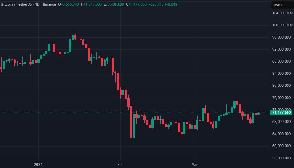 Уже 23 марта рынок перешел к росту после заявления о прогрессе в переговорах. Тогда биткоин снова поднялся выше $71 000.