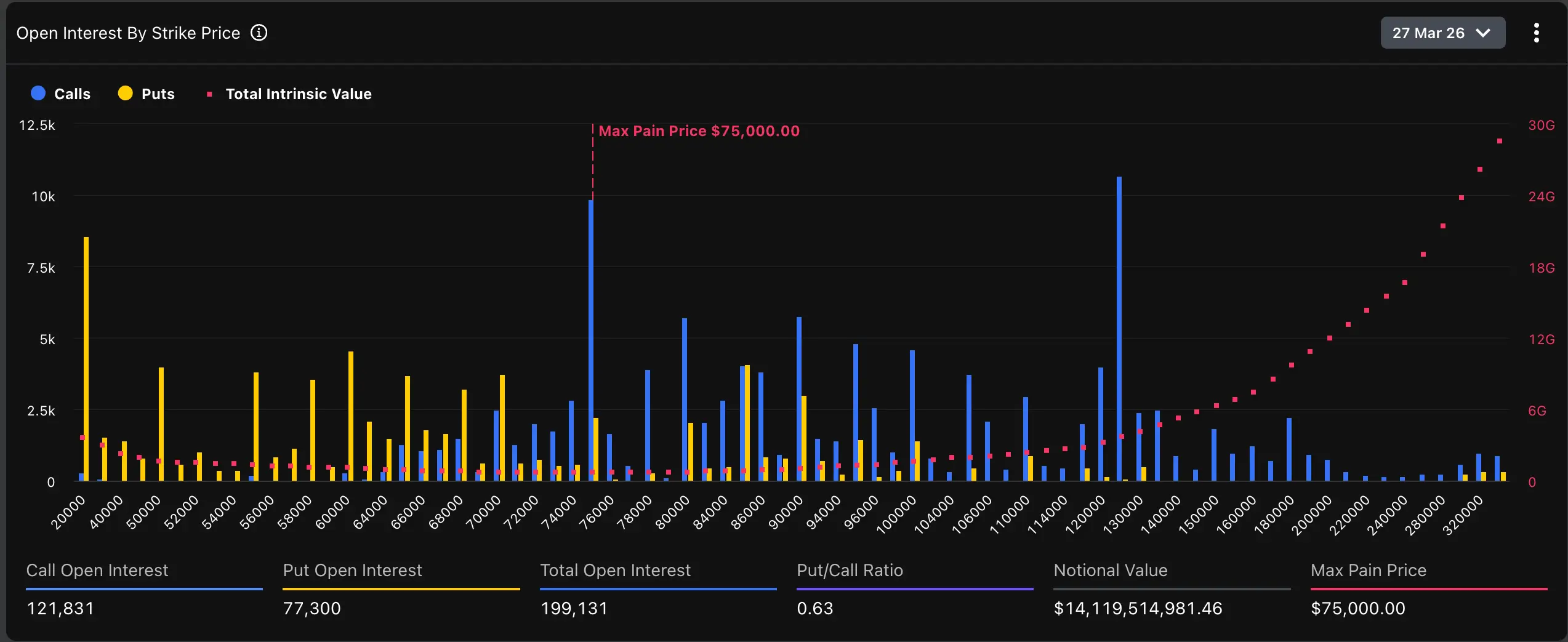 По данным Deribit, цена «максимальной боли» — уровень, при достижении которого большинство контрактов истекут без выплаты прибыли (как невыигравшие лотерейные билеты), — находится ровно на отметке $75 000.