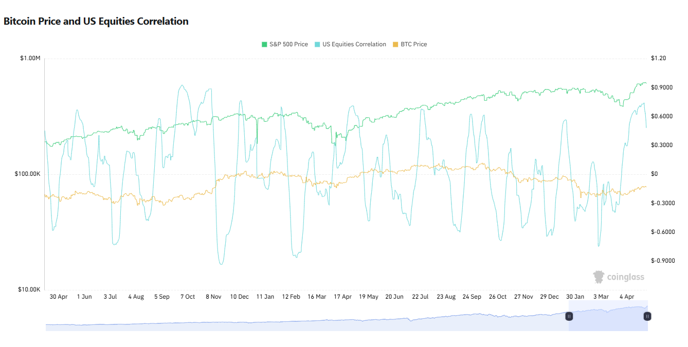 Биткоин и, как следствие рынок в целом, тесно коррелирует с ценными бумагами. Так, например, 25 апреля 2026 года этот показатель достиг 0,74, по данным CoinGlass, что является максимумом с ноября 2024 года.