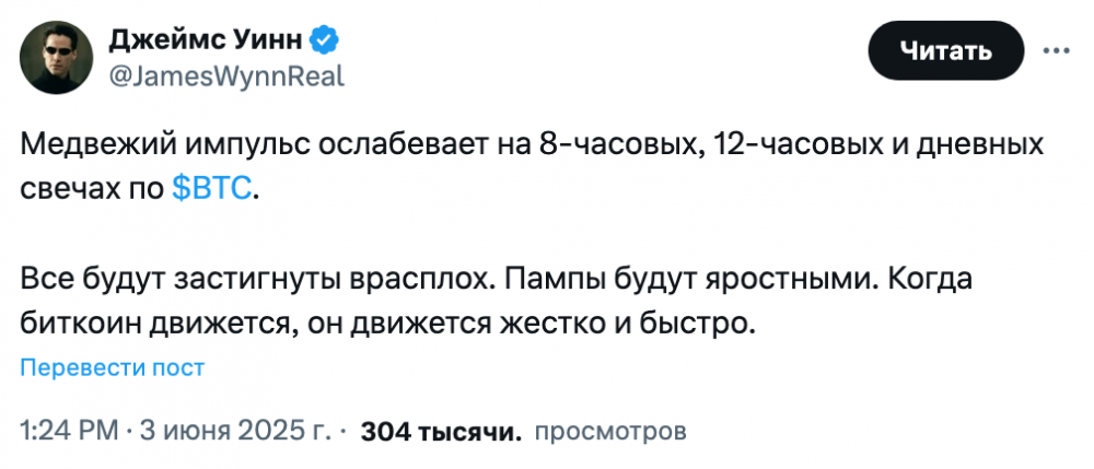 «Медвежий импульс слабеет», — написал Уинн в последующем посте X 3 июня, предсказывая грядущий рост биткоина, который застанет инвесторов «врасплох».