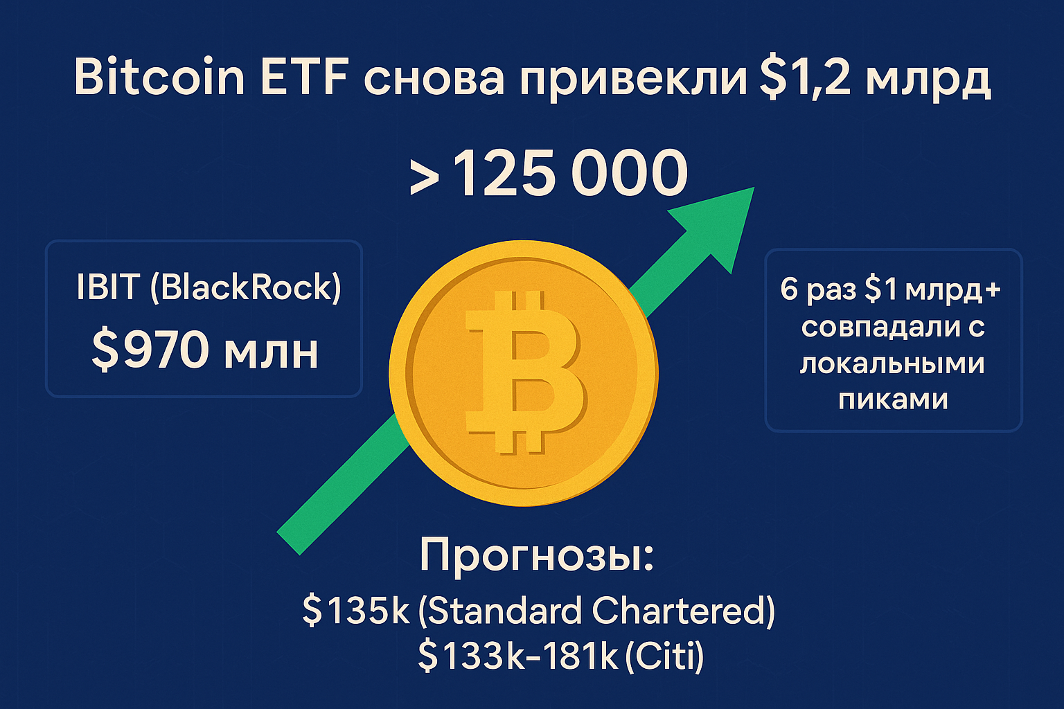 В понедельник американские спотовые ETF на биткоин зарегистрировали чистые притоки в размере $1,2 млрд, причем основная часть средств (примерно $970 млн) пришла в фонд IBIT (iShares Bitcoin Trust).
