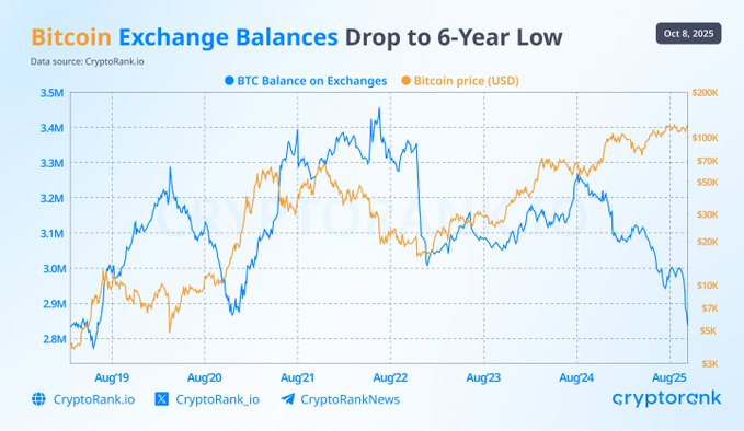 Запасы биткоина (BTC), находящиеся на централизованных криптобиржах, снизились до минимального уровня за последние шесть лет. Такой отток с площадок эксперты связывают с ростом популярности самокастодиальных решений, институциональными покупками и снижением доверия к централизованным платформам.