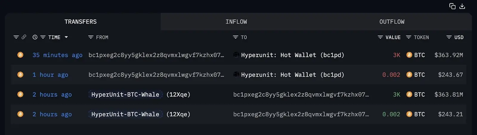 Во вторник кит перевел биткоины на сумму $360 млн на горячий кошелек «bc1pd» протокола децентрализованных финансов (DeFi) Hyperunit. По данным платформы данных о блокчейне Arkham, это был первый перевод за два месяца.