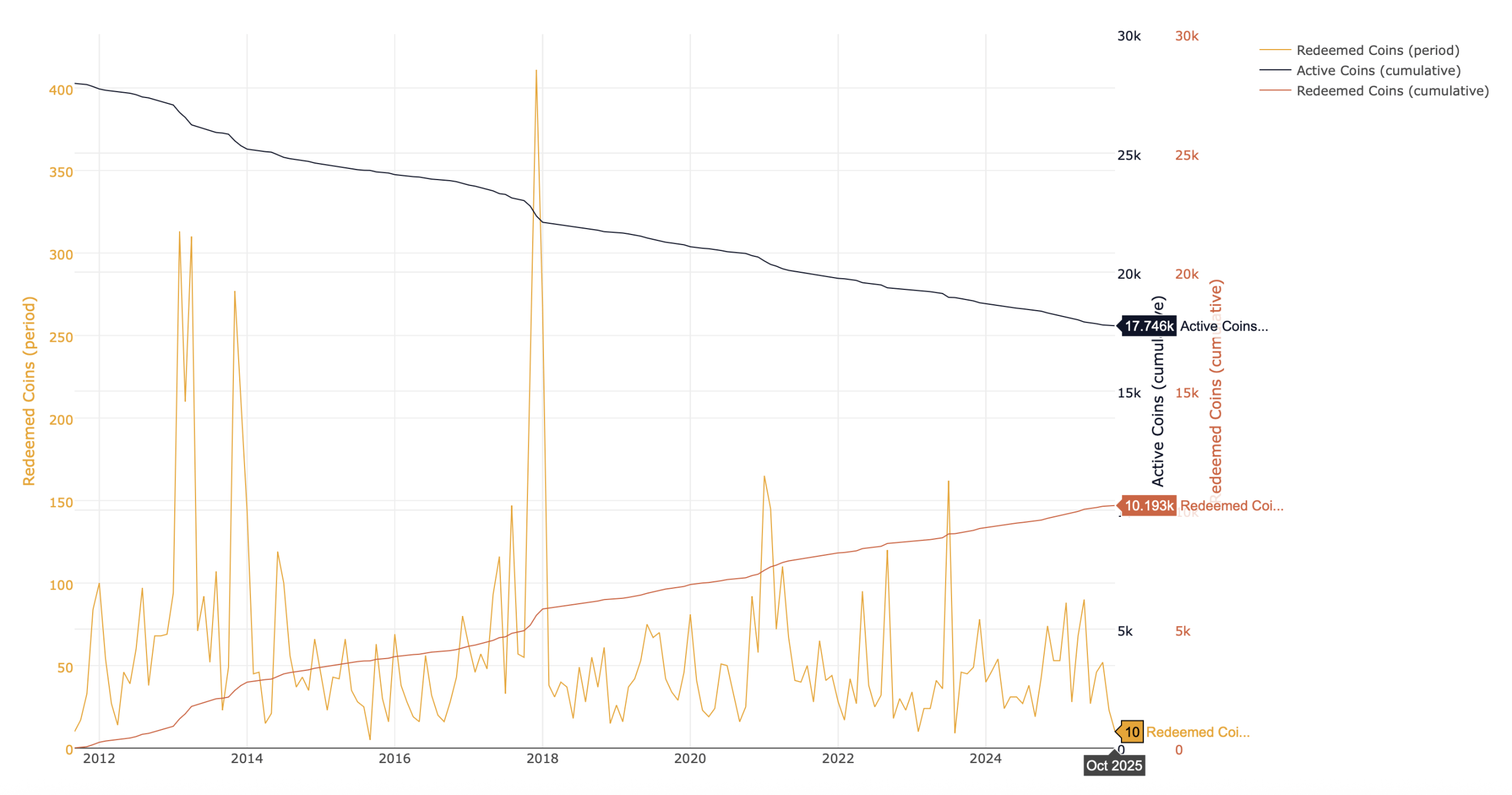 С начала года данные показывают, что около 432 физических биткоинов Casascius были вскрыты и обменены, раскрывая примерно 1,100 BTC внутри, стоимостью более $119 миллионов по сегодняшним обменным курсам. Даже после всех этих действий по “очистке”, более 38,000 BTC, стоимостью свыше $4 миллиардов, остаются запечатанными в 17,746 активных монетах Casascius, всё ещё храня своих криптографических сокровищ.