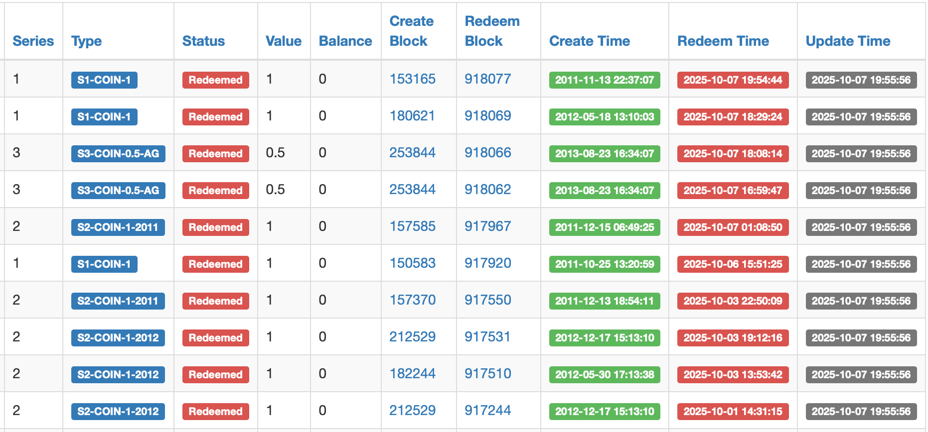 Каждая монета ведёт своё происхождение с начала 2010-х, охватывая серии 1, 2 и 3, отчеканенные с октября 2011 по август 2013 года. Большинство из них были латунными токенами номиналом в один биткоин, но две серебряные монеты “S3-COIN-0.5-AG” из августа 2013 года также встретили свою судьбу. К тому времени, как ведение по вскрытиям прекратилось 7 октября, все десять монет были официально помечены как “Выкуплены”, с пустыми балансами и всем прочим.