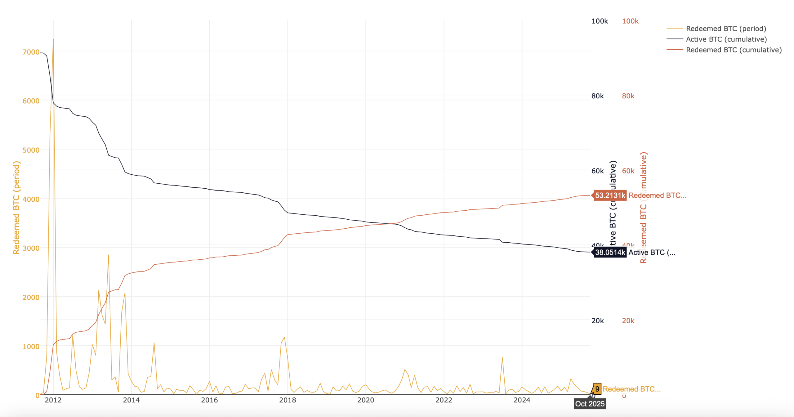 К концу 19 октября 2025 года были выкуплены всего 10,193 экземпляров Casascius, оставив лишь 17,746 единиц всё ещё активными — крошечные реликвии осязаемого прошлого биткоина. На момент написания статьи всего 38,051 BTC (стоимостью $4.14B) остаётся запечатанными внутри, в то время как 53,213 BTC (стоимостью $5.8B) были выкуплены из своих блестящих оболочек. Данные casasciustracker.com показывают, что монеты Серии 1 всё ещё сияют как оригиналы, но многие из них были вскрыты за эти годы.