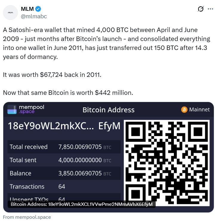 Данные платформы memepool space, позволяют предположить, что кит когда-то владел 7850 BTC и последний раз был активен в июне 2011 года, когда он объединил 4000 BTC на одном адресе.