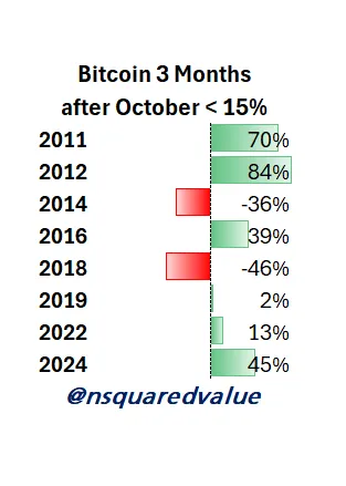 «Средняя трехмесячная доходность биткоина после слабого октября составляет 11%, а после сильного — 21%», — отметил он.