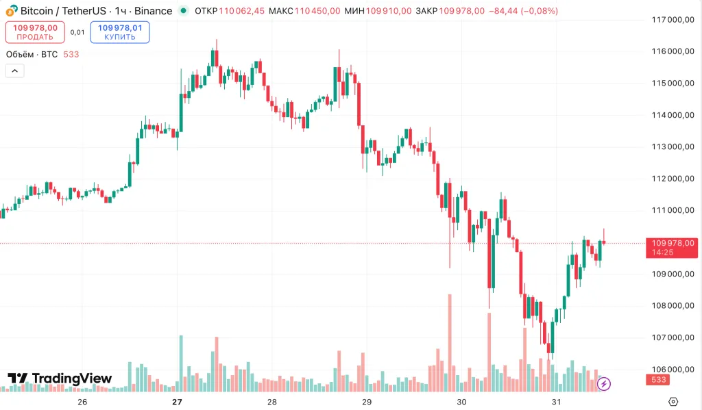 На момент написания первая криптовалюта торгуется около $110 000. За последние сутки курс монеты опустился на 0,3%.