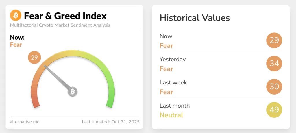 Индекс страха и жадности находится на уровне 29, сигнализируя о преобладании пессимистичных настроений. За сутки показатель снизился на пять пунктов.