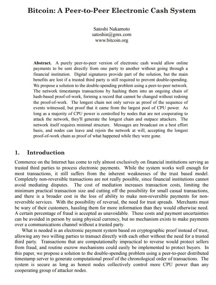 Документ под названием «Биткоин: система цифровой пиринговой наличности» описывал одноранговую сеть, в которой транзакции можно совершать напрямую без посредников.