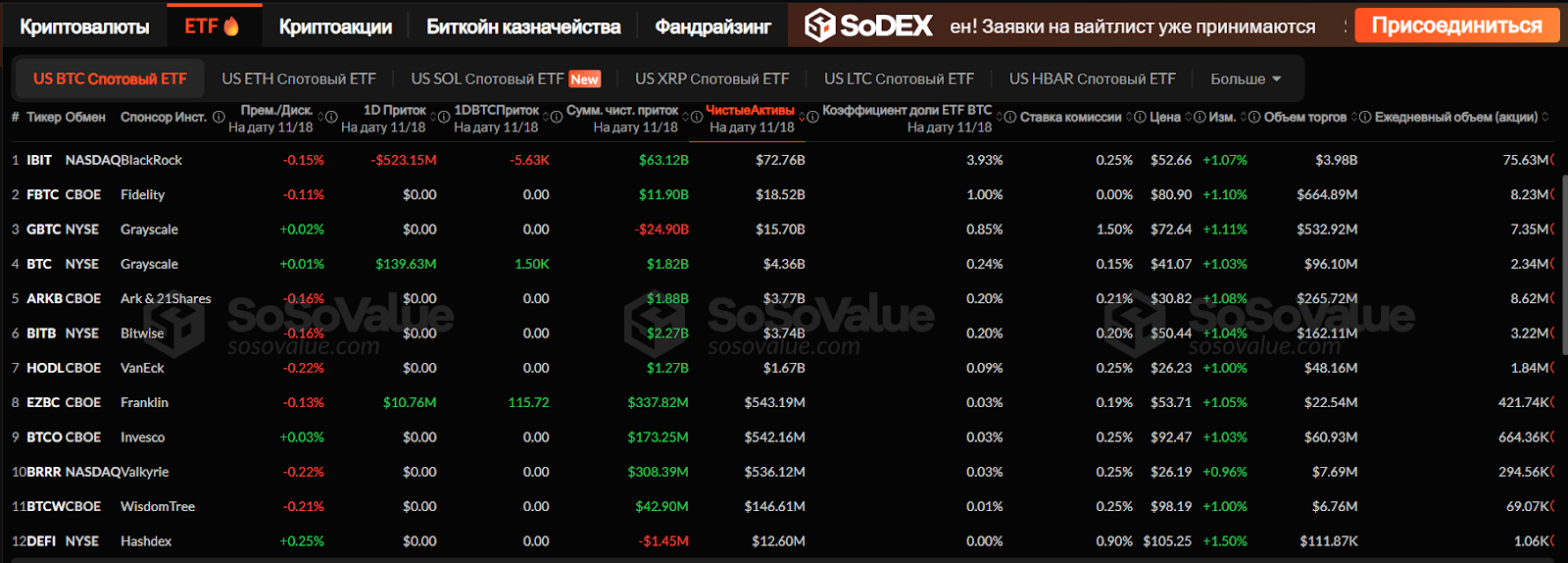 На рынке спотовых биржевых фондов на базе биткоина также зафиксированы крупные оттоки капитала. Крупнейший BTC-ETF IBIT столкнулся с рекордным выводом средств за всю историю существования ($523,15 млн за сутки).