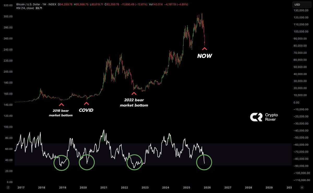Криптовалютный инвестор Crypto Rover фиксирует, что RSI биткоина сейчас находится на уровне, который может указывать на начало медвежьей фазы рынка.