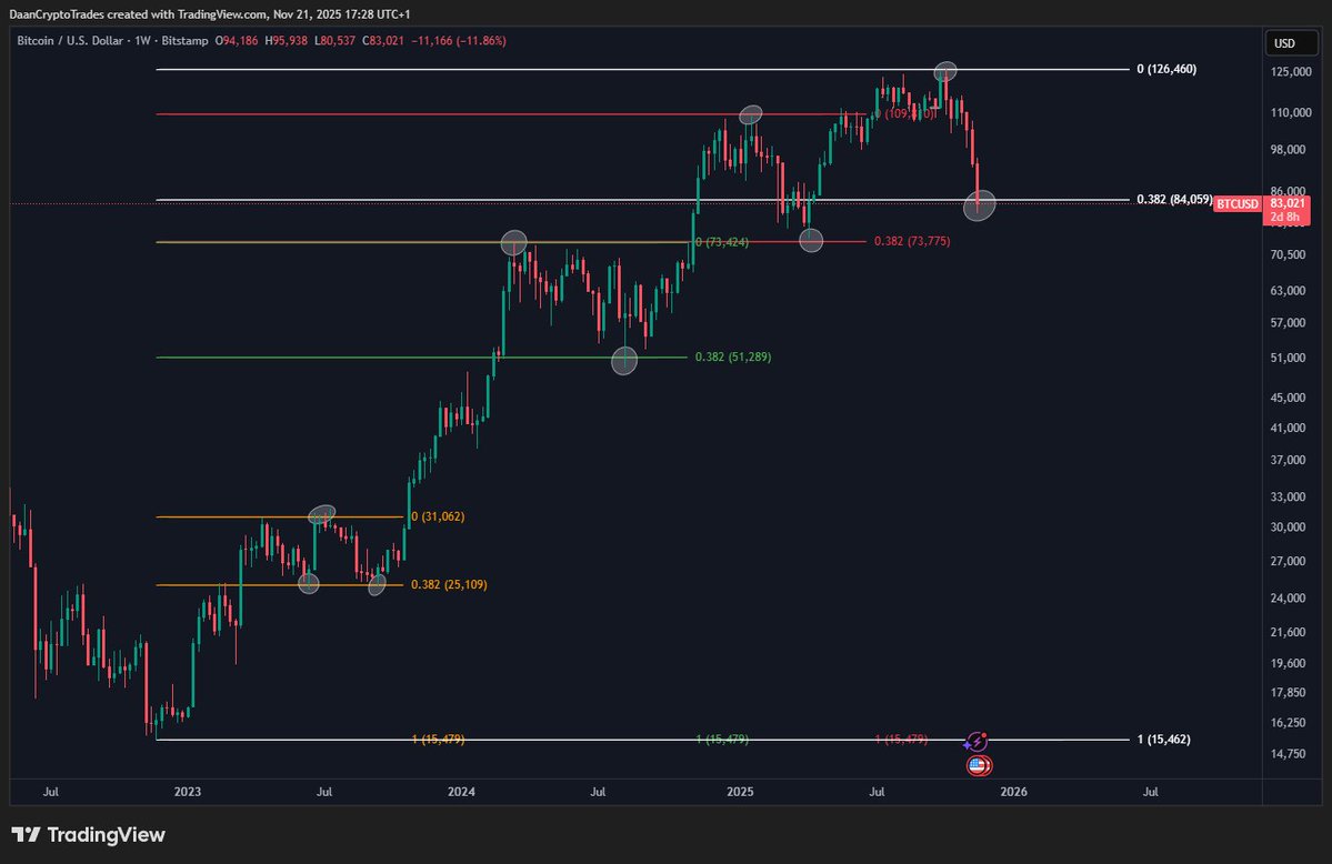 Трейдер Daan Crypto Trades обращает внимание на падение до уровня коррекции Фибоначчи 0,382 на недельном тайфрейме, который отмечал дно каждой крупной коррекции в текущем цикле. По его словам, движения становятся больше в номинальном выражении по мере роста цикла, но по сути мы видим примерно одинаковые коррекции с точки зрения процентного размера.