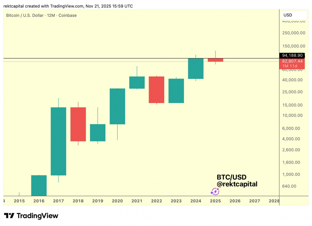 Аналитик Rekt Capital считает, что тот факт, что биткоин сейчас находится ниже уровня четырехлетнего цикла около $93 000, указывает значительность текущей коррекции. История показывает, что цена должна завершить 2025 год зеленой свечой, закрывшись выше $93 000, а затем в 2026 году начнется медвежья фаза рынка.
