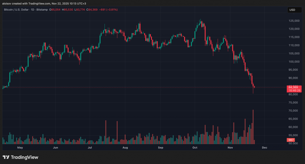 Цена первой криптовалюты на бирже Bitstamp 21 ноября кратковременно опускалась до $80 537, что означает падение на 36% по сравнению с историческим максимумом, достигнутым 6 октября. Коррекция вызвала острую дискуссию среди аналитиков о том, завершился ли текущий бычий цикл или рынок переживает временное снижение.