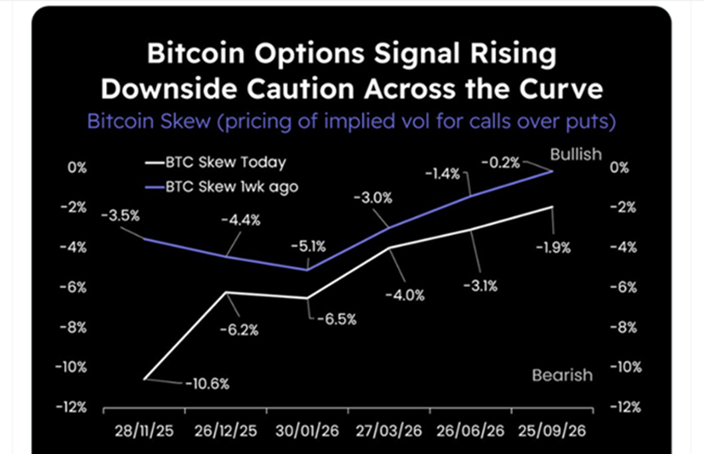 В Matrixport сообщили об усилении за последнюю неделю медвежьего характера графика распределения подразумеваемой волатильности (skew). При этом, долгосрочные риски стали оцениваться более негативно.