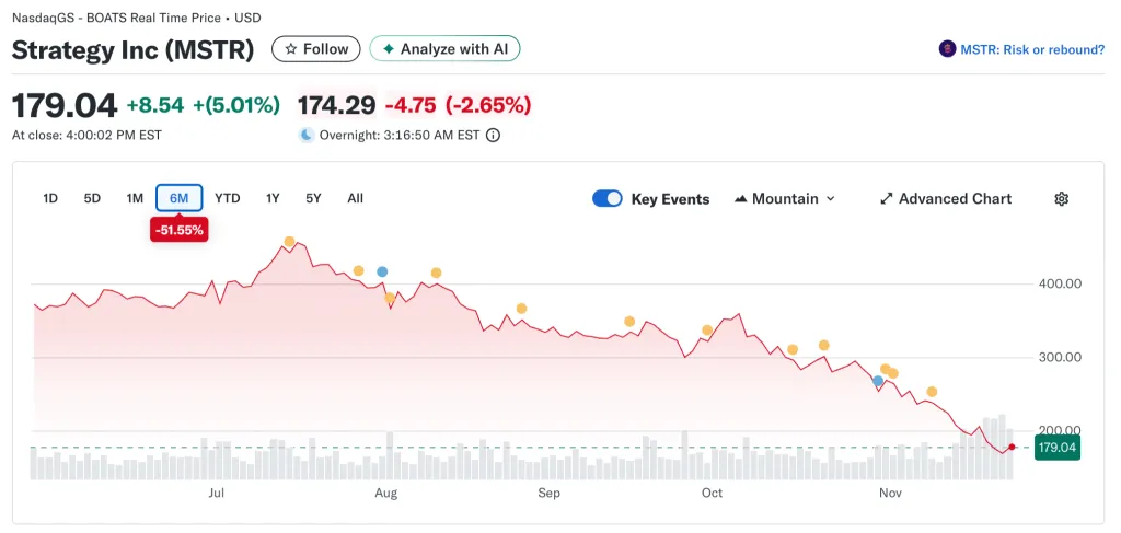 За последние полгода котировки акций компании Майкла Сэйлора снизились более чем на 51% — с $370 до $179.