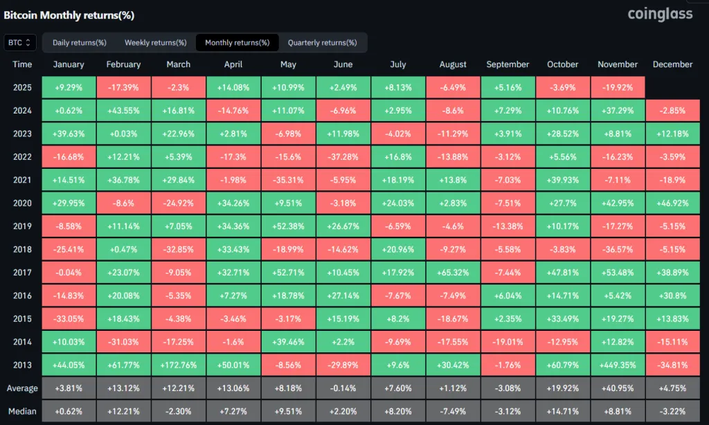 Ноябрь традиционно считается сильнейшим месяцем для первой криптовалюты со средней доходностью 40,95%. Однако в этом году котировки снизились более чем на 23% с начала месяца. Октябрь также закрылся падением на 3,69%.