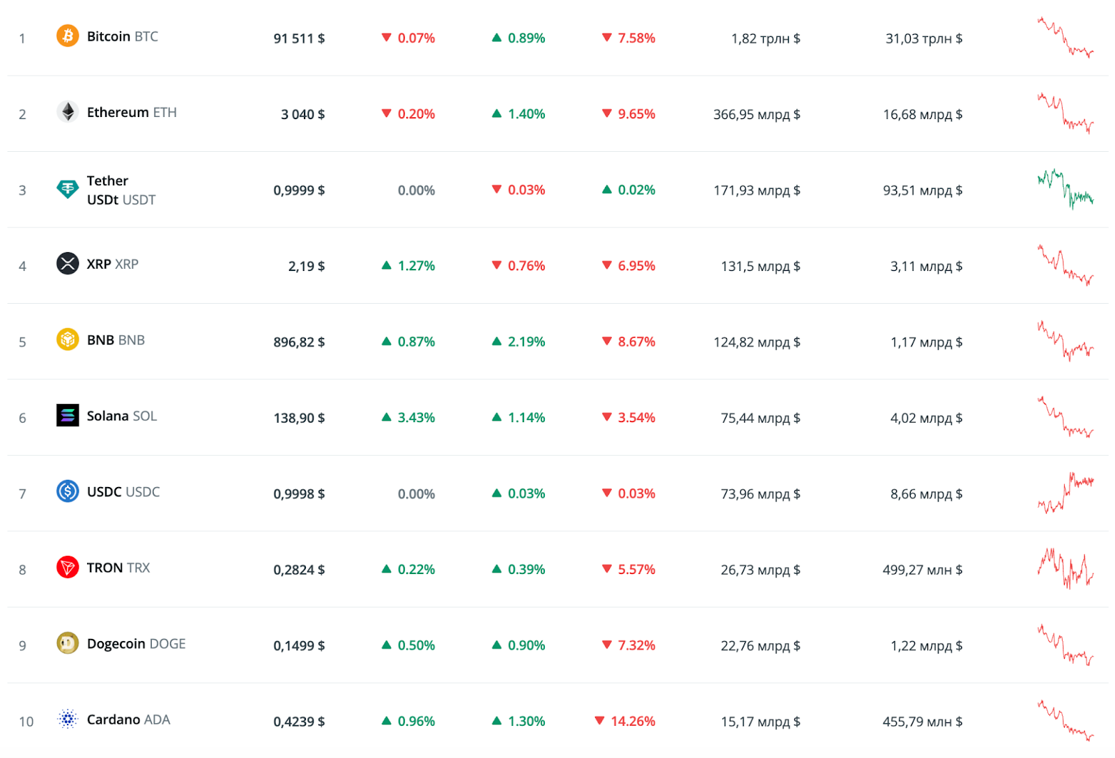 Монеты из топ-10 по рыночной стоимости продемонстрировали сдержанную динамику. Выделилась Solana (SOL), чья цена подскочила на 3,4% — до $138,8. Остальные токены выросли на 0,2%-1,2%.