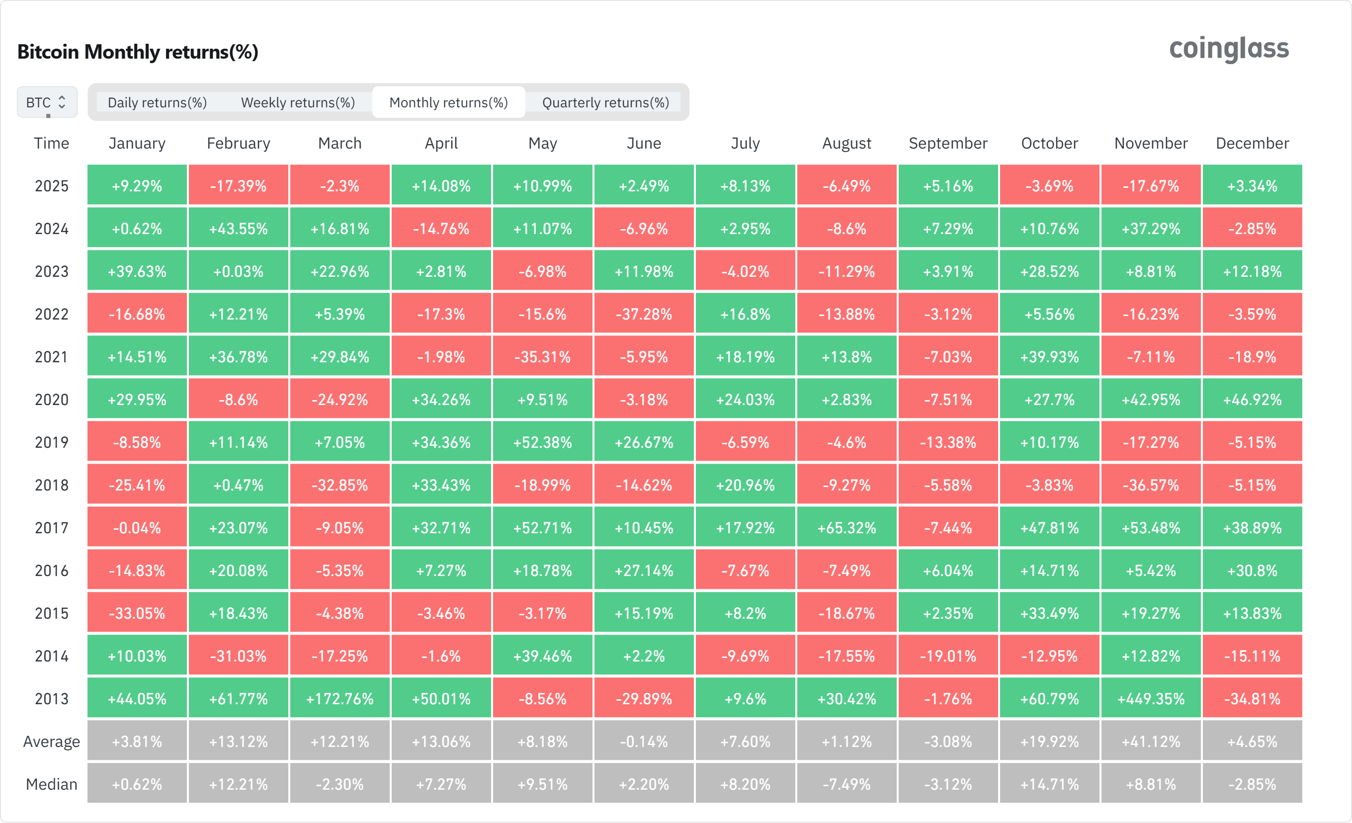 Декабрь для биткоина никогда не был однозначным месяцем, пишет ведущий аналитик Bitget Research Райан Ли. За 12 лет, с 2013 до 2024 года, семь лет декабрь завершался снижением курса, а пять раз показывал рост. Существенное падение по итогу декабря наблюдалось только дважды: 34,8% в декабре 2013 года и 19% в декабре 2021 года. В остальном декабрь если и завершался снижением курса, то незначительным в масштабах крипторынка — до 5%.