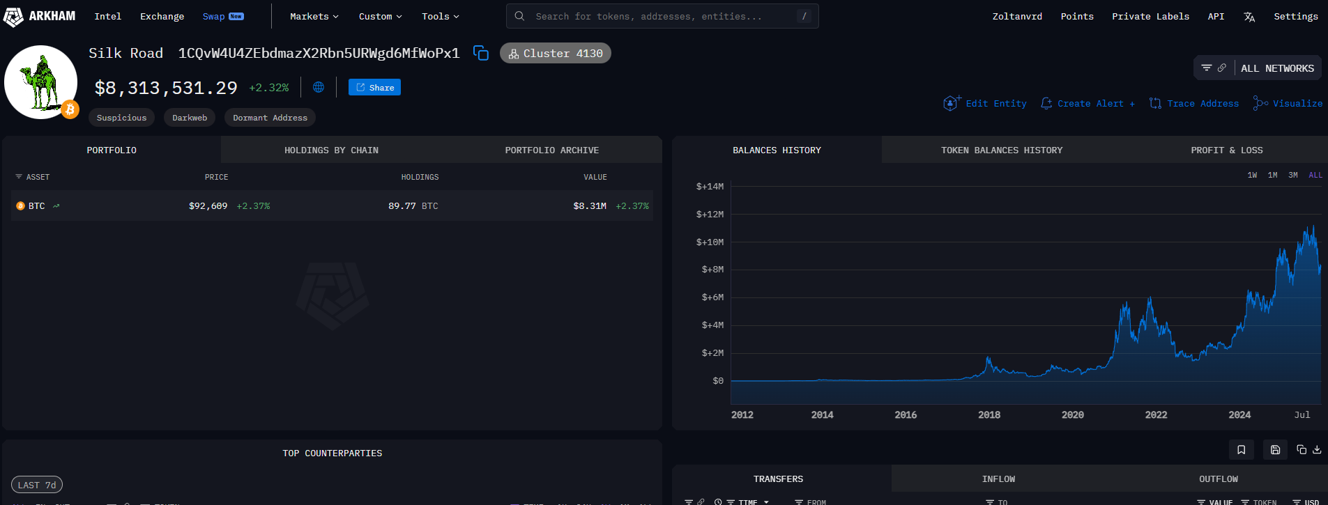 В другом кошельке, помеченном как принадлежащий Silk Road и, вероятно, Ульбрихту, хранится 8 300 000 долларов в биткоинах. По данным Arkham, за исключением трех небольших тестовых транзакций за последние 10 месяцев, кошелек неактивен уже 14 лет.