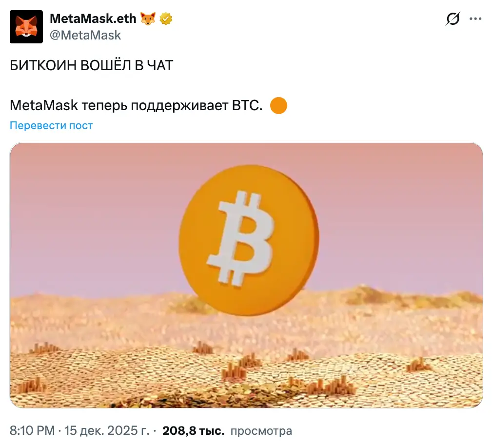 «Поддержка биткоина — это еще один шаг в нашем мультичейн‑расширении после запуска Monad и Sei в этом году. В 2026 году появятся и другие сети», — заявили в MetaMask.