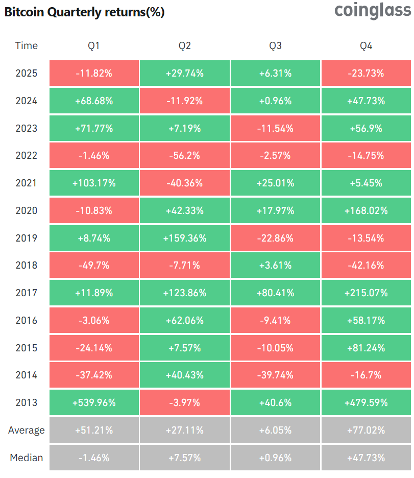 Исторически четвертый квартал считался самым благоприятным периодом для биткоина. Средняя доходность превышала +77%, медианная держалась в районе +48%. Эти цифры десятилетиями формировали ожидания «новогоднего ралли» и подпитывали оптимизм трейдеров. Текущий результат выбивается из этой картины .