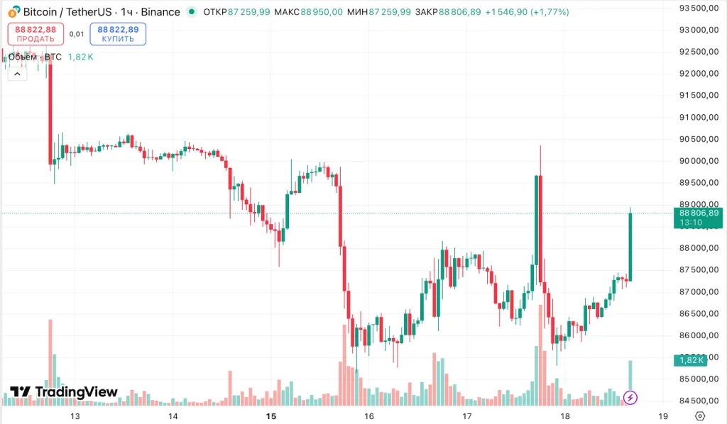Цена биткоина позитивно отреагировала на новость, увеличившись на 1,5%. На момент написания первая криптовалюта торгуется около $88 800. В то же время курс Ethereum поднялся на 2% — до ~$2900.