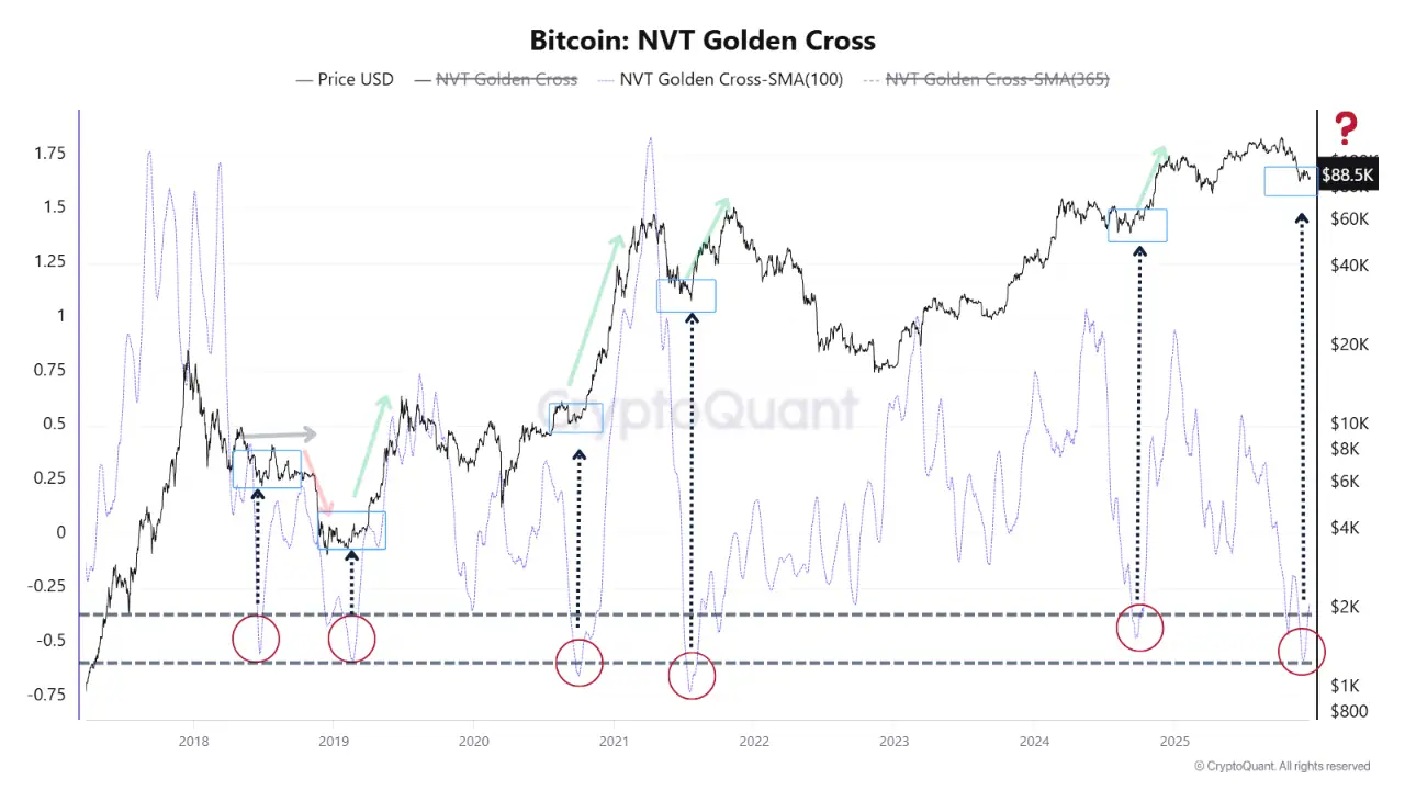 Кроме того, эксперты CryptoQuant отметили, что происходит повторное переосмысление рыночной оценки биткоина. В основе их оценки — показатель NVT Golden Cross, который оценивает, насколько рыночная капитализация соответствует объему транзакций в сети.