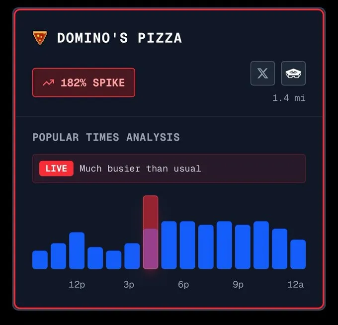 По его словам, он обратил внимание на рост «индекса пиццы» и сделал ставку. Индикатор отображает количество заказов из ближайших пиццерий Domino’s Pizza, расположенных около Пентагона. Это считается косвенным признаком увеличения активности вооруженных сил США.