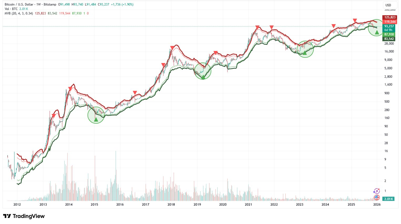 Три предыдущих Weekly MVB Buy отмечены на графике зелеными кружками. Они пришлись на начало 2015, 2019 и 2023 годы. В каждый из этих периодов рынок находился в фазе заметных коррекций после продолжительного роста. Цена опускалась к нижней зеленой полосе индикатора, затем начинался разворот вверх, и долгосрочный восходящий тренд продолжался.