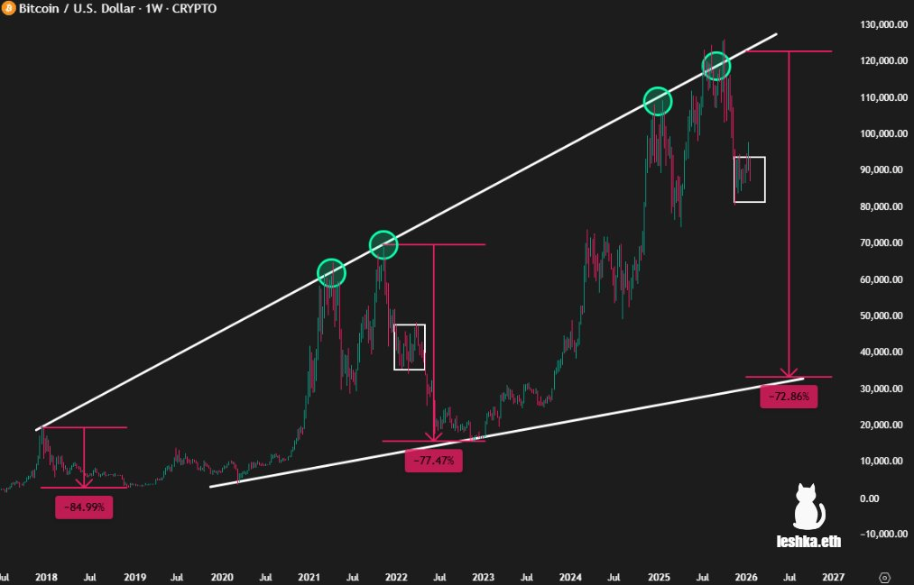 В то же время автор под ником Leshka.eth видит на графике криптовалюты паттерн, аналогичный 2021 году, и прогнозирует падение биткоина до $30 000-40 000, а альткоинов — к нулю. Он призывает открывать короткие позиции и покидать рынок
