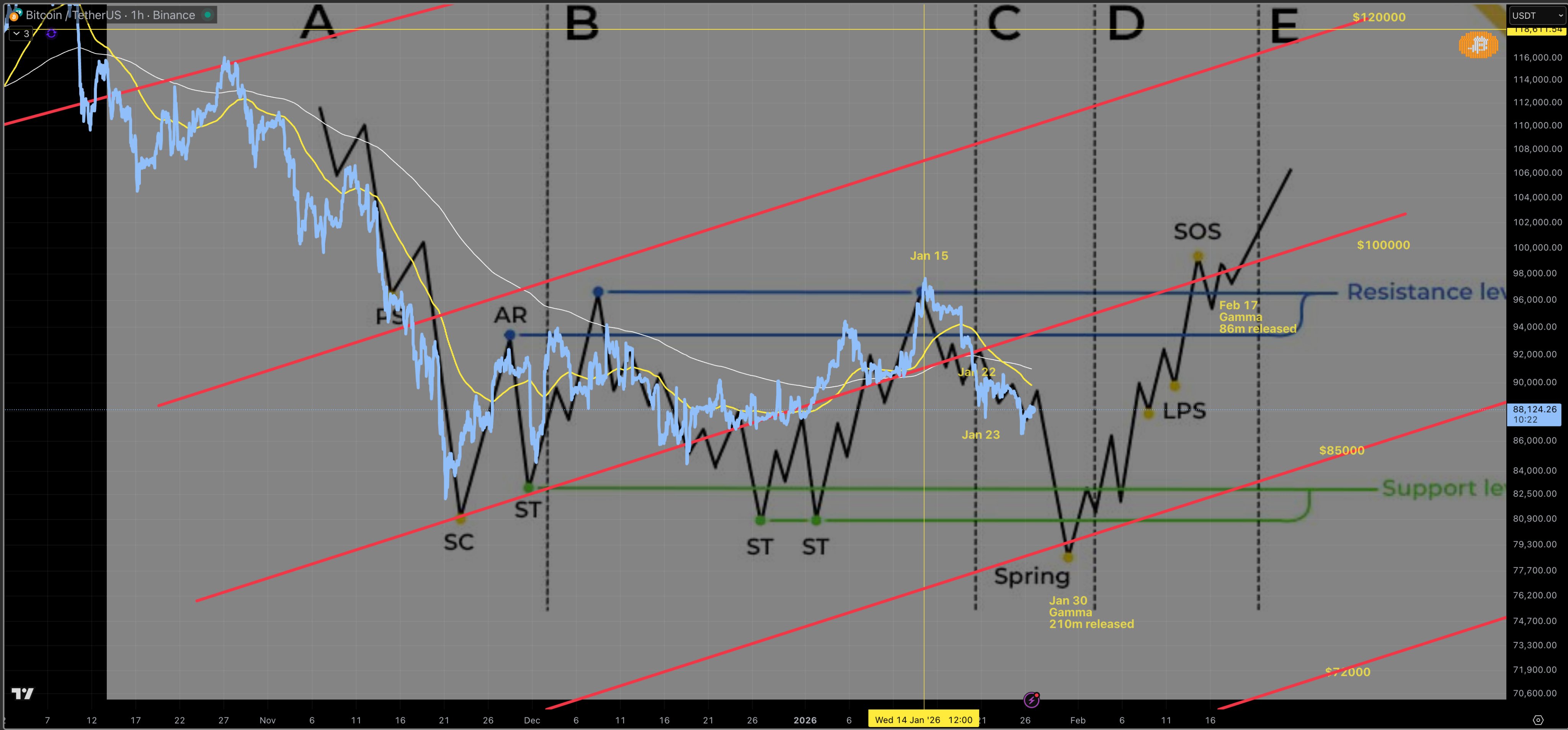 Используя метод Вайкоффа, эксперт ожидает формирование ключевого долгосрочного минимума, известного как «спринг», по паре BTC/USDT примерно в тот же период.