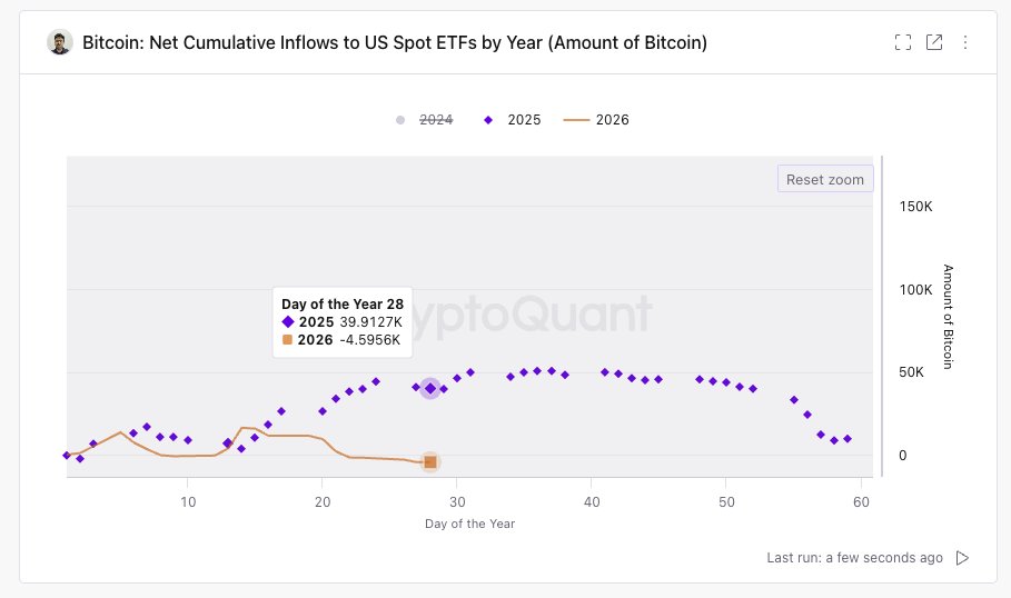 По данным главы отдела исследований CryptoQuant, с начала 2026 года спотовые биткоин-ETF зафиксировали чистые продажи в объеме около 4600 $BTC.