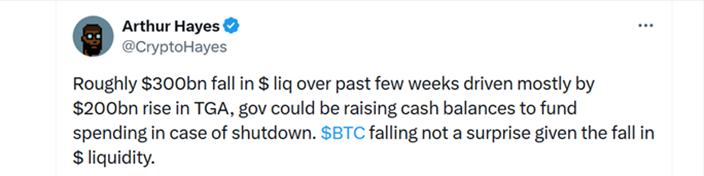 Соучредитель BitMEX Артур Хэйес объяснил развитие нисходящей динамики оттоком ликвидности из системы в размере $300 млрд в последние несколько недель. Эксперт подчеркнул, что $200 млрд пополнили счет Казначейства США в Федрезерве для продолжения финансирования расходов исполнительной власти в условиях вероятного шатдауна.