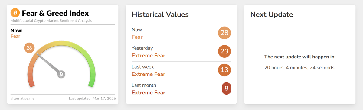 Индекс страха и жадности вышел из зоны экстремального страха в зону страха, подскочив с 23 до 28 пунктов.