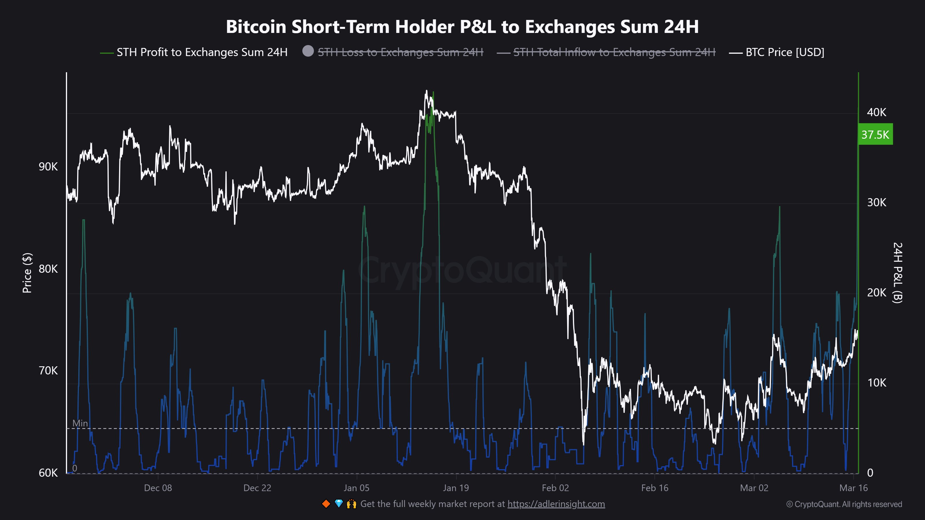 Аналитик Maartunn зафиксировал скачок переводов краткосрочными инвесторами биткоинов на централизованные биржи до пика с 15 января (37 500 $BTC).
