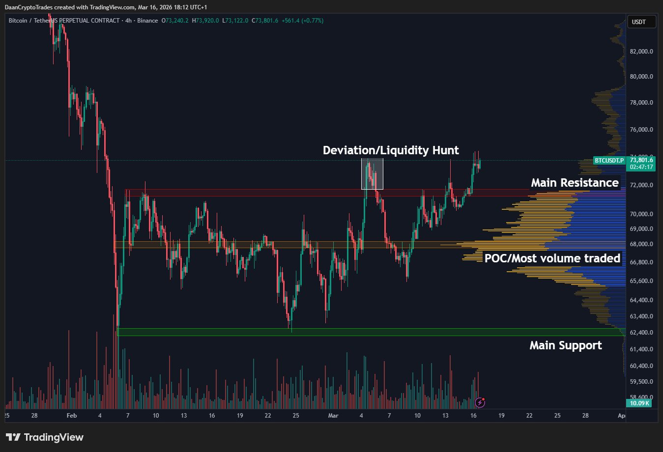 Трейдер Daan Crypto Tradesсообщил о третьей попытке прорыва $74 000. Эксперт отметил, что о закреплении можно будет судить в случае закрытия выше этого рубежа в течение одного-двух дней.