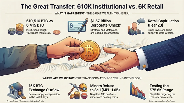 «Статистическая пропасть огромна: за последние 30 дней крупные инвесторы накопили впечатляющие 610 516 $BTC против скромных 6 415 $BTC от розничной торговли. Биткоин конвертирует потолок 2024 года в новый институциональный минимум, сосредоточив капитал на тестировании диапазона $75 600 (уровень безубыточности казначейств). Теперь акцент переключается на подтверждение этого ненасытного аппетита с помощью притоков ETF. Скрытая сила уже сделала ставки; сохраняйте бдительность и тактические позиции», — призвали специалисты.